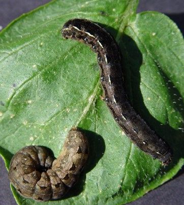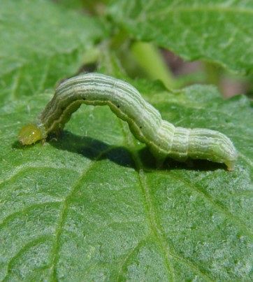 Scouting: Loopers may be found feeding on the leaves during the day. Other species are nocturnal and are more difficult to scout, but they may be found by lifting up the plants and looking at the soil surface. Caterpillars get larger as they progress through several larval instars; growing up to 1.5 to 2 inches long.